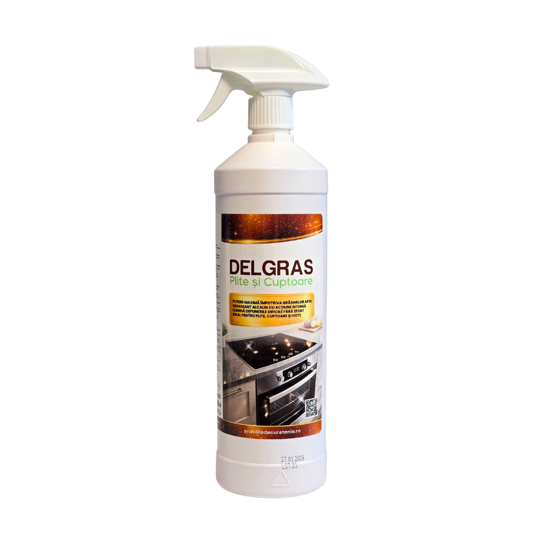 DELGRAS Plite și Cuptoare este un degresant profesional extrem de concentrat, creat special pentru eliminarea rapidă și eficientă a grăsimilor arse și a murdăriei persistente din bucătărie. Formula sa cu caracter puternic alcalin acționează în profunzime, dizolvând depunerile dificile rezultate în urma gătitului intens, fără a necesita frecare excesivă.