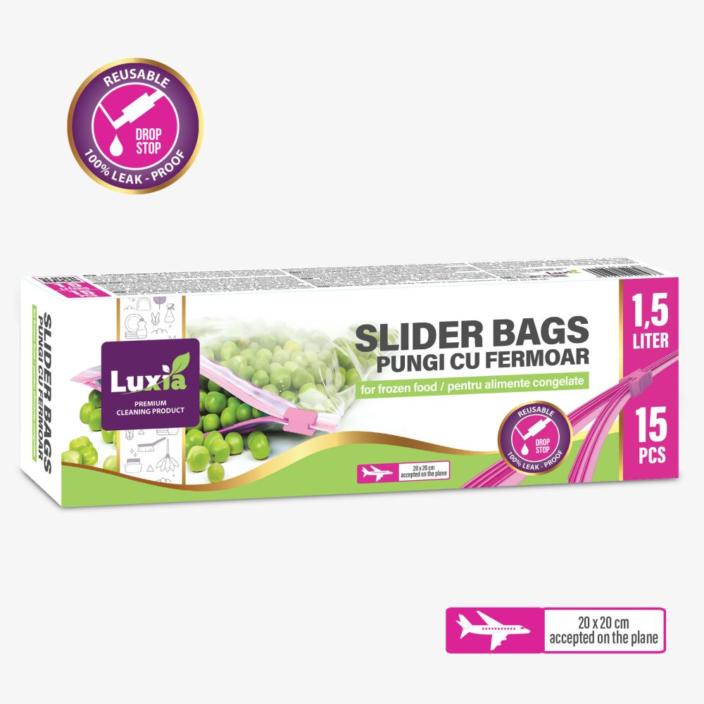 Păstrează alimentele proaspete și bine protejate cu pungile alimentare Luxia, dotate cu fermoar culisant. Cu o capacitate de 1,5 litri și dimensiuni de 20×20 cm, aceste pungi sunt reutilizabile, rezistente la scurgeri (100% leak-proof) și potrivite pentru congelator.