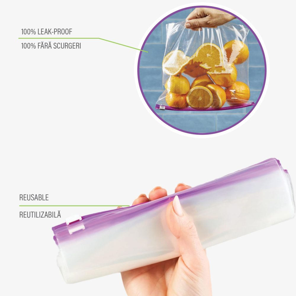 Ușor de folosit datorită fermoarului culisant, îți oferă siguranță și confort la ambalarea alimentelor sau în călătorii.