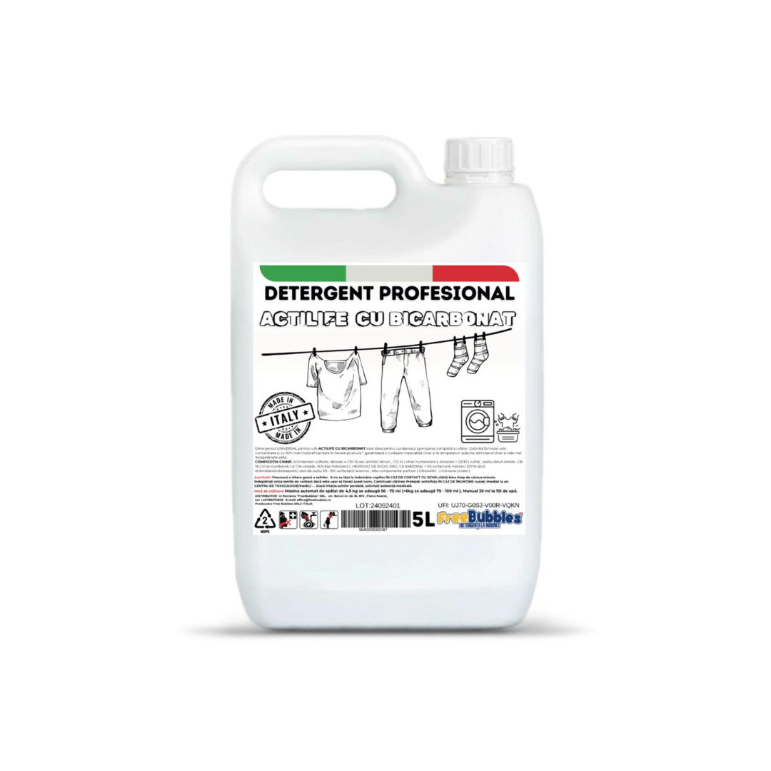 Detergentul profesional universal ACTILIFE 5 Kg pentru rufe, cu bicarbonat este ideal pentru curațarea și igienizarea completă a rufelor. Datorită formulei sale concentrate și cu 30% mai multa eficacitate în fiecare picatura, garantează o curătare impecabilă chiar și la temperaturi scăzute, eliminand chiar și cele mai încapațânate pete. Pentru spalare manuala utilizati 30 ml. Pentru spalare cu masina de spalat utilizati 50-70 ml pentru 4.5 kg rufe si + 25 ml pentru 8 kg rufe.
