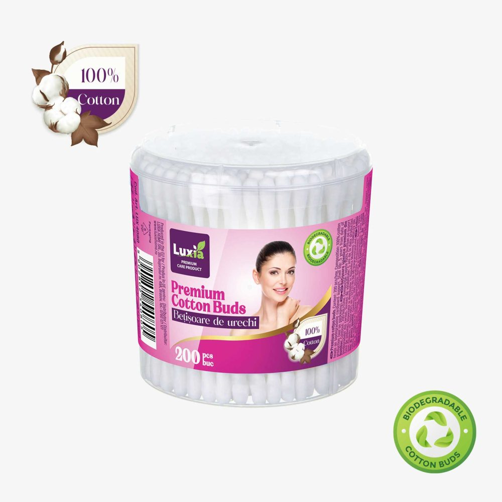Bețișoarele igienice Luxia Premium sunt realizate din 100% bumbac natural, fiind delicate și sigure pentru îngrijirea zilnică. Vârful moale din bumbac oferă confort maxim, iar tija rezistentă asigură o utilizare practică și eficientă.