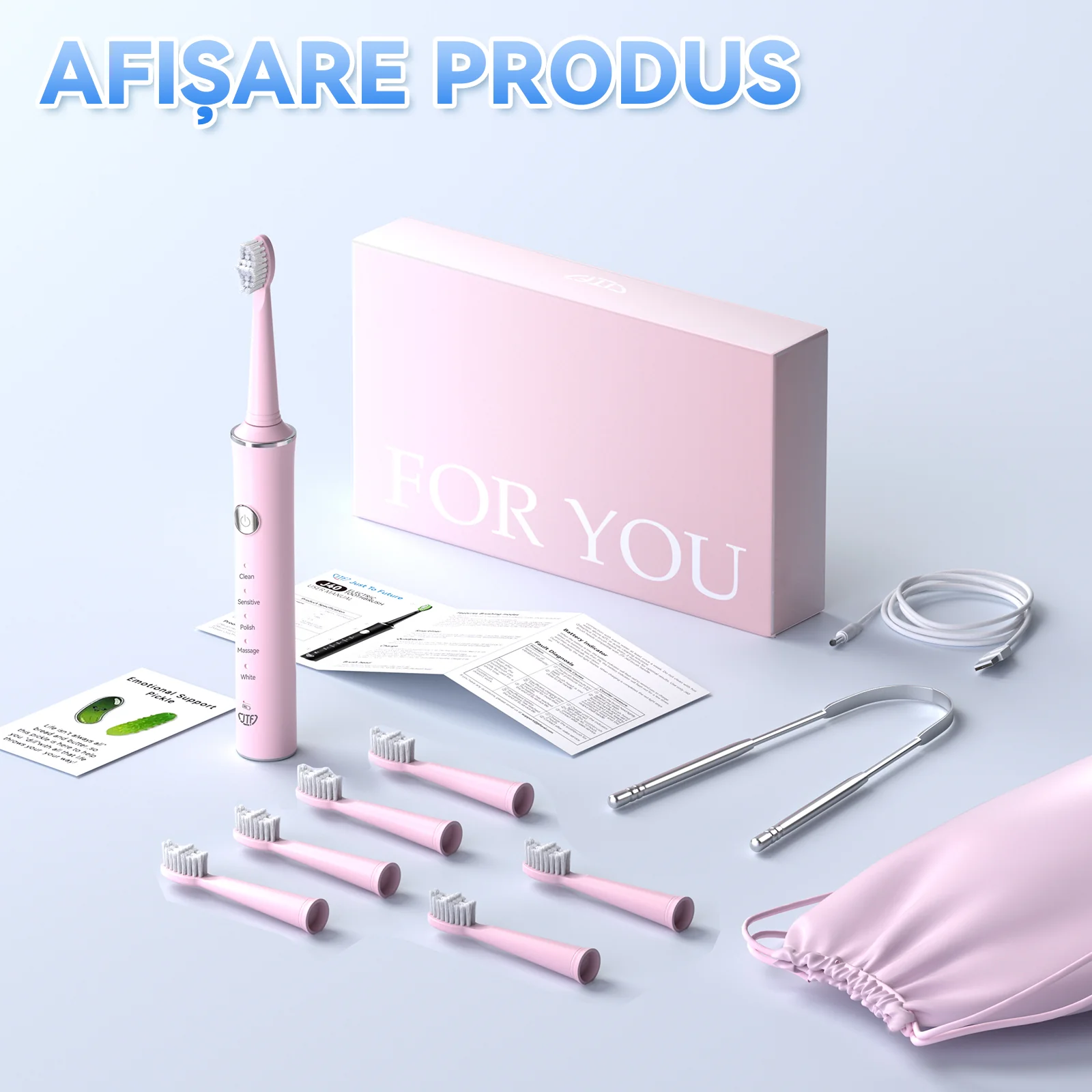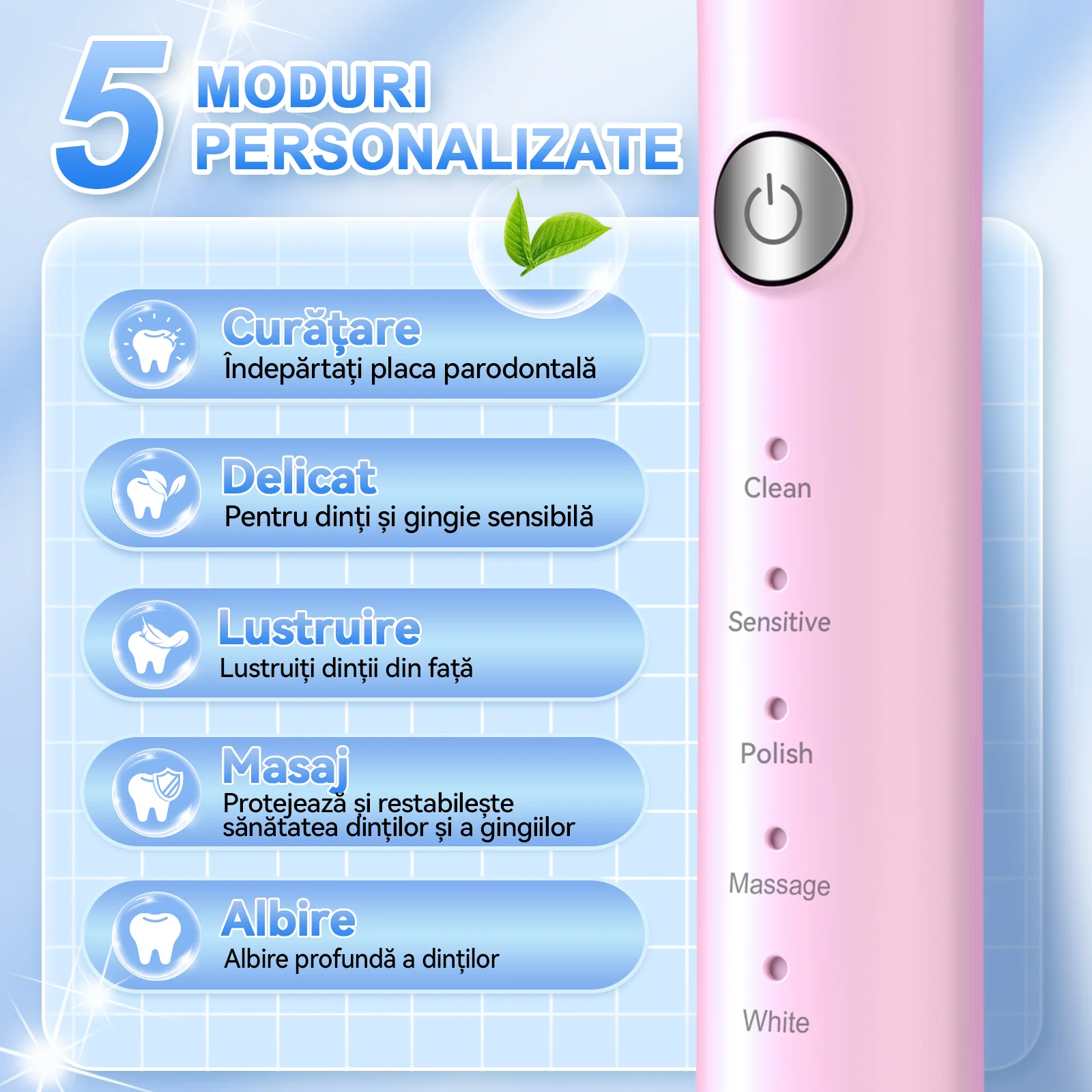 - Moduri multiple de curățare: Ideală pentru diverse nevoi orale, cum ar fi curățarea zilnică, albirea dinților sau protecția gingiilor sensibile.
