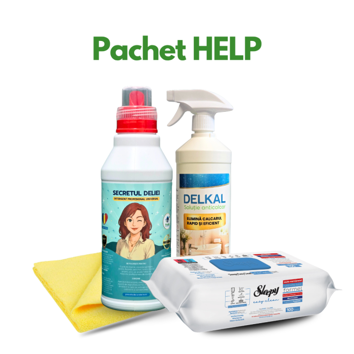 Pachetul HELP este alegerea ideală pentru o curățenie completă în întreaga locuință, reunind produse profesionale esențiale pentru rufe, suprafețe și baie, într-un singur kit eficient și avantajos.