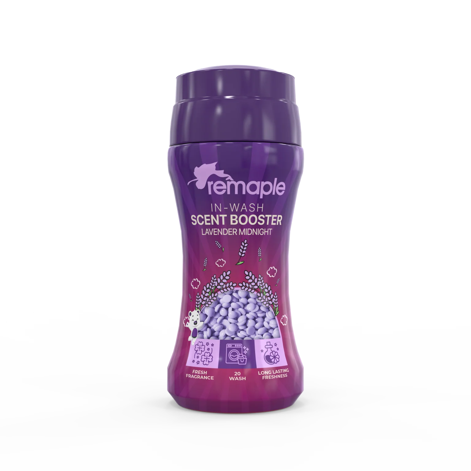 REMAPLE Lavender Midnight sunt perle parfumate pentru rufe, concepute pentru a oferi hainelor un parfum elegant și relaxant, cu prospețime de lungă durată. Formula avansată REMAPLE Scent Booster menține mirosul plăcut al rufelor până la 12 săptămâni, chiar și după depozitare.